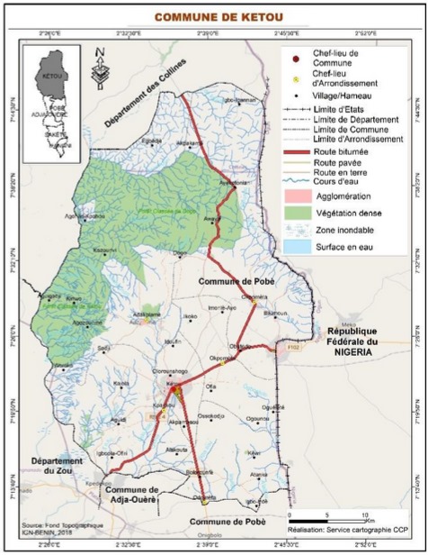Localisée à l’extrême nord du département, la commune de Kétou est limitée au Nord par les communes de Savè et de Dassa-Zoumè (Département des Collines), au sud par les communes de Adja-Ouèrè et de Pobè, à l’Est par la République Fédérale du Nigéria, et à l’Ouest par la commune de Zangannado (Département du Zou).